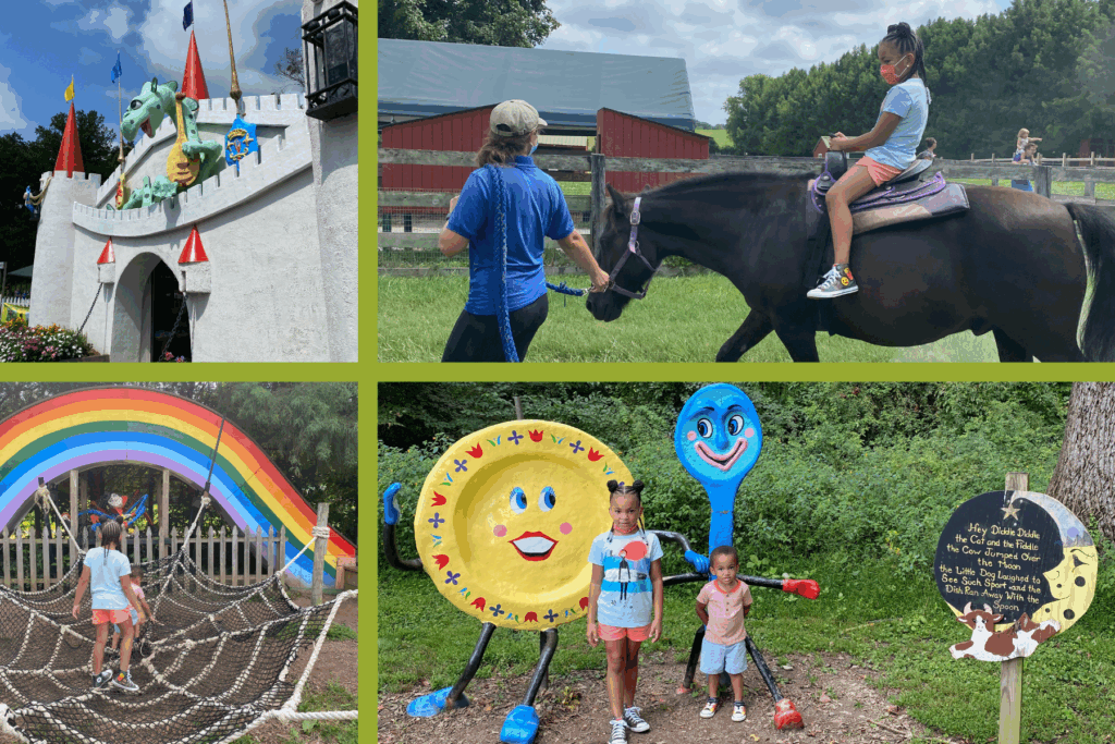 Summers Farm is HUGE with a few extra amenities like campfire rentals, Fireworks on Saturday nights in October and 45+ attractions for kids of all ages. During our visit, we played mini golf, rode the zip line, ran through the obstacle course and tried tug-o-war. There’s also a mega slide ($5) add-on. Check out their special events page for children’s entertainment & pig race dates/times!